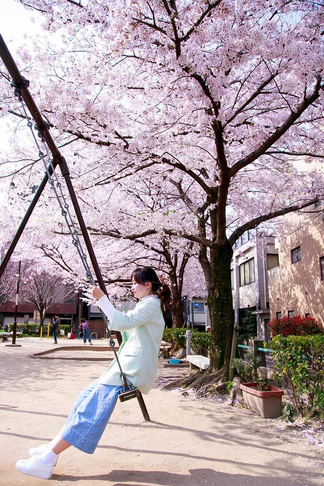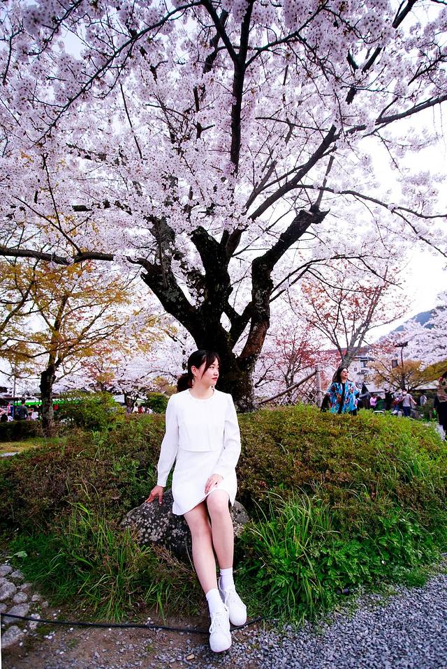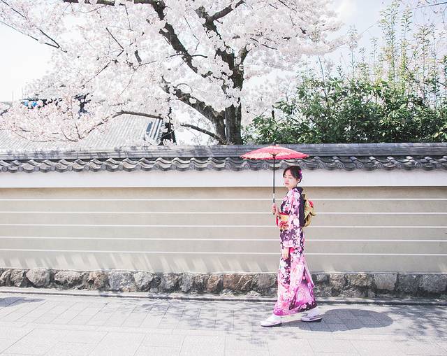 在樱花季建议以浅颜色衣物为主,裙装为主;白色、米色、淡粉、浅蓝都与樱花古寺相得益彰。而枫叶季的时候,较为深色的衣服与红叶就搭配适宜了。设想一下,在淡淡的樱花树下,远处是淡蓝色的晴空和青黄色的古寺,小姐姐一件黑色的皮夹克、一双黑色的长筒靴配丝袜,即便再美,多少也给人一种现代与古代穿越的尴尬。