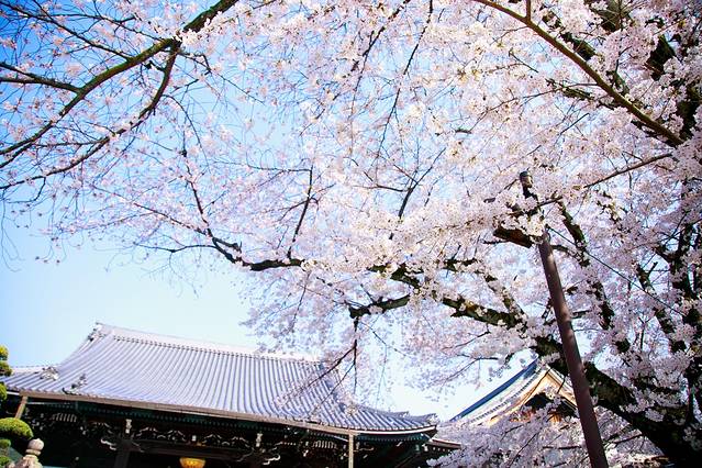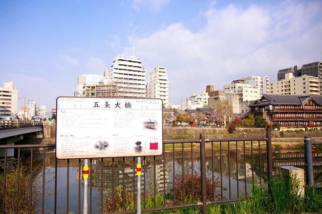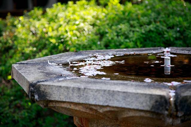 沿着五条坂走上百二十步,过一条马路,就是大谷本寺,一条石桥通向寺的门口,石桥前有几棵全开的樱树,下面聚集了好多游客。我们避开人群,在小桥上看看桥下闪着金光的水面和成群的金鱼。
