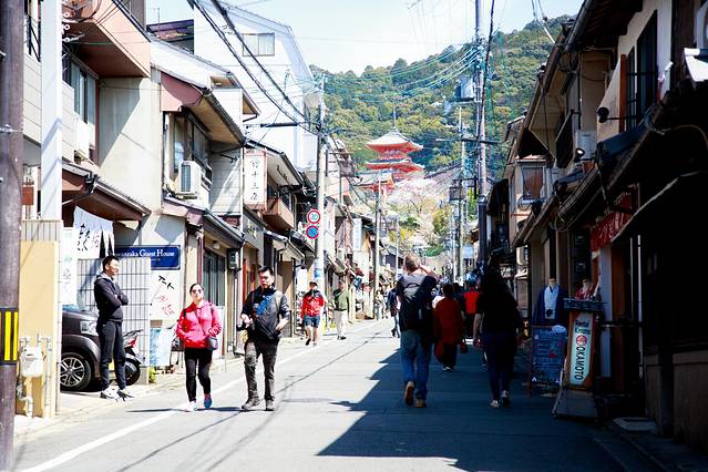 从清水寺出来就是二年坂三年坂,此道被称为清水寺的神道,在以前,这条坂路因为经常有产妇去清水寺祈求顺利生产,也被人们称为安产坂。时至今日,已经成为了纪念品、土特产、及餐厅矗立的日式商业街。还有一个传说是“在三年坂摔倒的人三年内会死去”,我想这条传说明显不适用于樱花季的今天,现在人挨着人,像极了 北京 高峰时期的换乘站,要想跌倒,哪是一件容易的事情呀大笑小蜂
