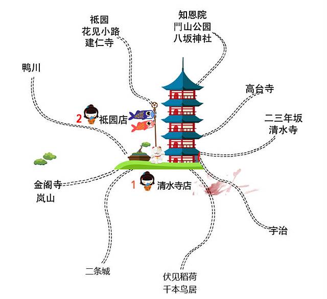 包括:祗园 建仁寺 八坂神社 花见小路 哲学小道 平安神宫 岚山 公园