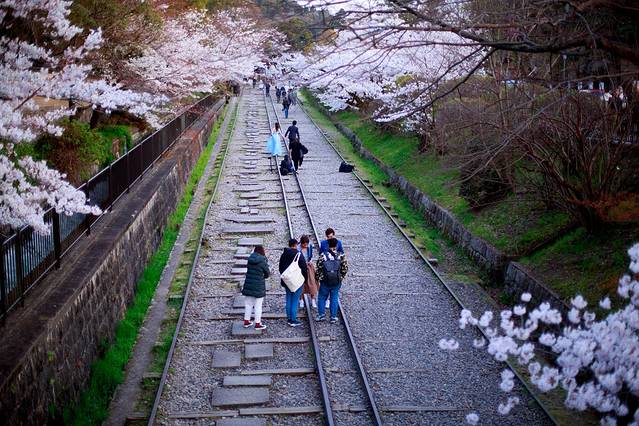 从南禅寺出来,临近的便是地铁蹴上站,这里也有一处赏樱胜地 —— 蹴上铁道 ,这里是名侦探柯南中柯南与服部走过的樱花铁道。虽已被废除使用,如今两侧的樱花树夹道,却成为热门的赏樱地点。旧铁道的灰石路与粉色樱花相衬托,有着独特的美感。当地人特别喜欢到这里漫步、野餐,同时也是拍小清新照的绝佳地点。