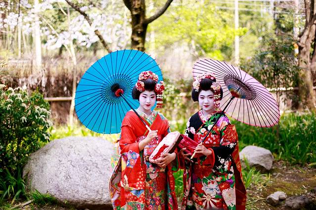 竹林中的一对少女,一身的艺伎打扮,很是漂亮。