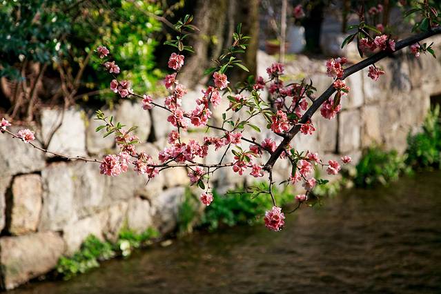 民宿藏密在一段桃花源般的小路间,路中央是一条清澈的小溪,浅浅的水湾随着春风泛起淡淡的波纹,小溪两旁是全开的樱花与翠绿的枝叶。像这样一个周末的清晨,偶有人轻声的从身旁走过,风吹动水和树叶的声音,听起来像是一种宁静的诉说。