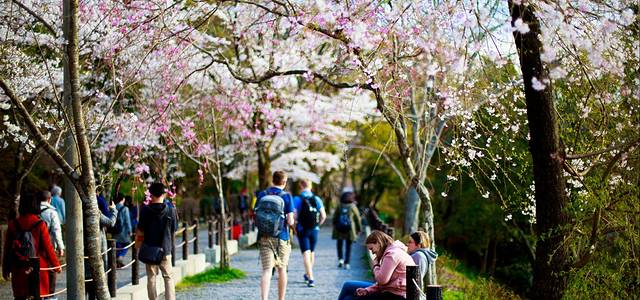 要说京都这座古城哪里是景点?哪里是名胜?小步姑娘觉得京都整体就是一座名胜,京都一共拥有17处世界遗产,上百所寺庙,没有半个月是完全看不完的。那么假如做好了一生只来一次京都的决心,这里我也为大家把京都所有的赏花圣地分成三类: