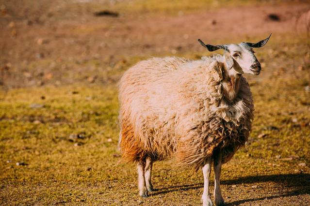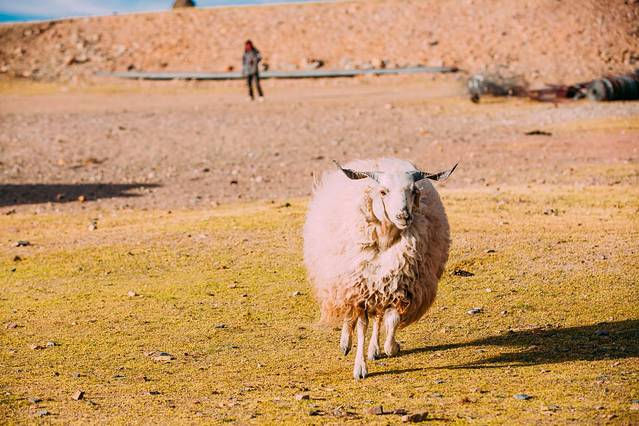 有一只走偏的哞哞羊,被我们吸引住,好奇地走过来。它浑身圆滚滚的,脑袋小小的,像极了广告中的小肥羊。这层厚厚的羊毛,看来是能织出一身毛衣来。