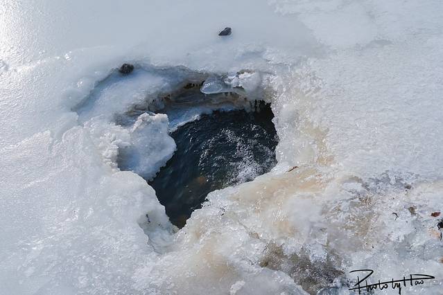 看到旁边有一个冰窟窿,看得出来冰层十分的厚,也冻的很结实。冰层下面咕嘟咕嘟的依然流动着活水。