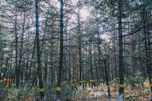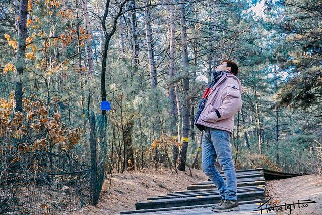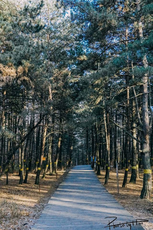 一路在林间穿梭,笔直的松树耸立,静听鸟语和风声。