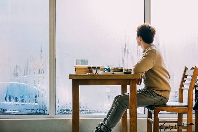 坐在窗边,窗户被室内外温差出的雾气所蒙蔽。