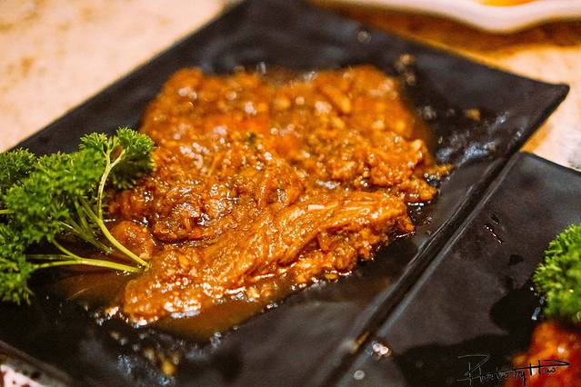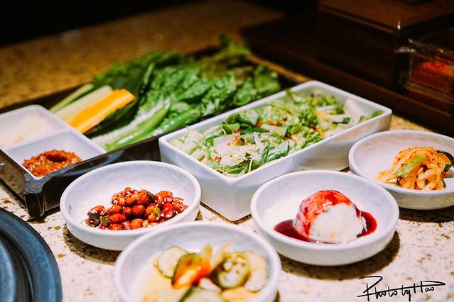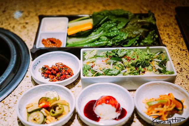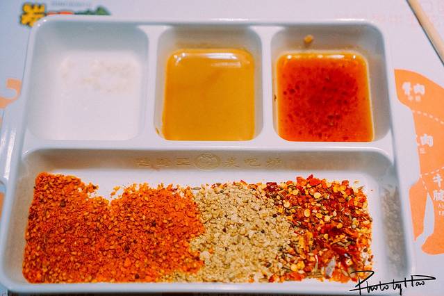 蘸碟十分丰富,除了 朝鲜 族烤肉习惯的纯盐和甜酱油等较为清淡的蘸料外,还有适合我这种无辣不欢的 四川 人的香辣蘸料,不过这个辣椒蘸碟主要以香料为主,辣度并不高。更能品尝出肉的原鲜味。