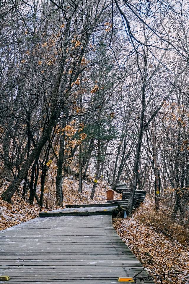 游玩帽儿山没有什么路线,就是沿着林中的木质栈道爬山登顶。帽儿山不高,登顶也很轻松,不怎么太费体力。