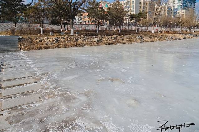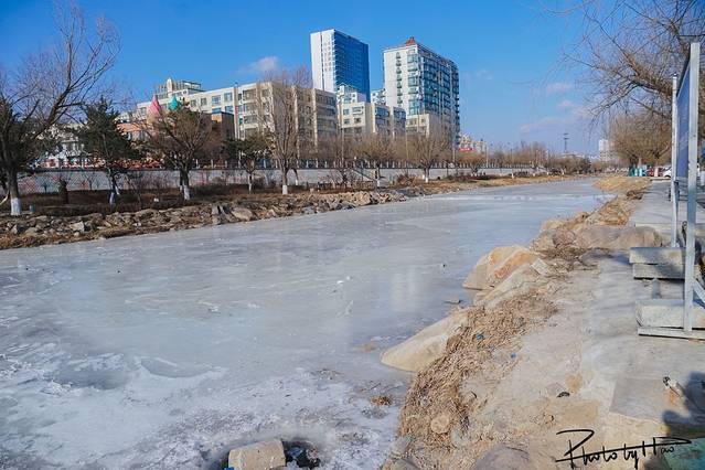 穿城而过的河道早已冻住,行人可以直接穿河而过。冰面比较滑,走的时候格外小心。