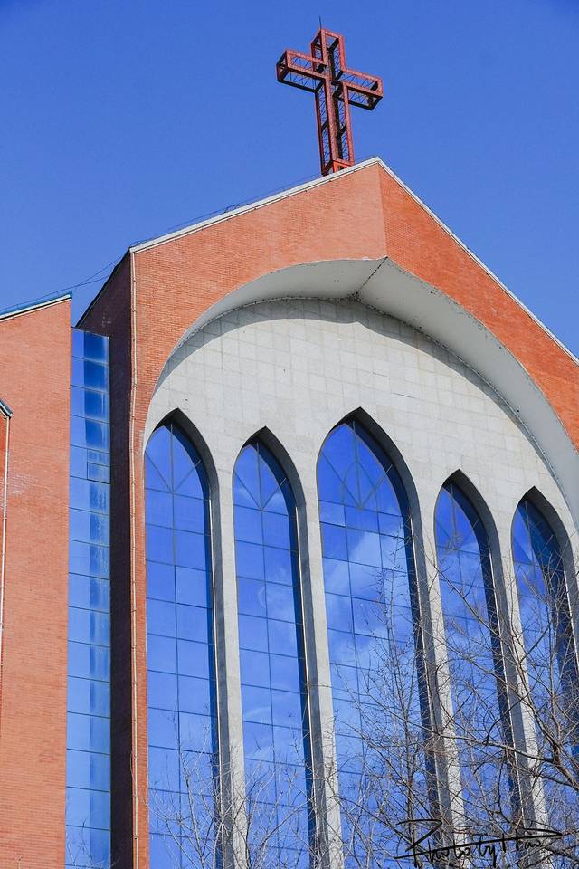 路过一个像基督教堂一样的建筑,整面的玻璃幕墙倒影出云彩飘动的样子。