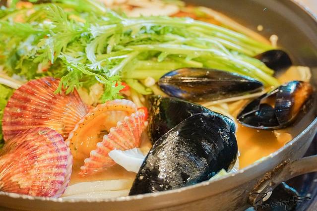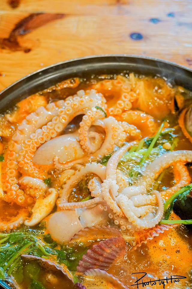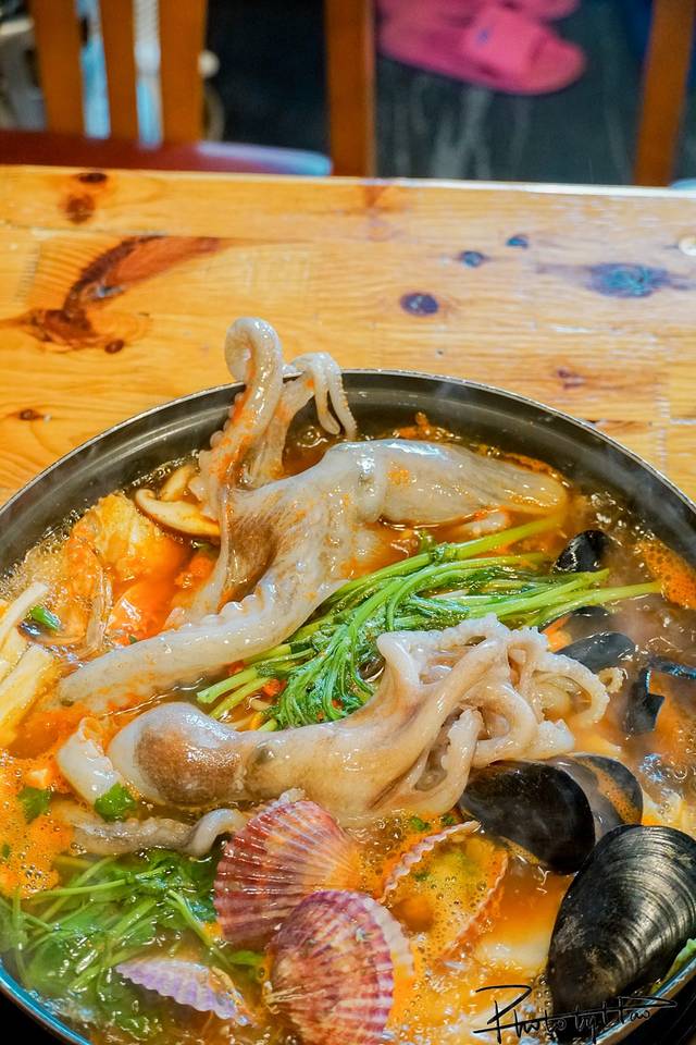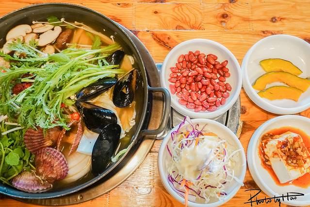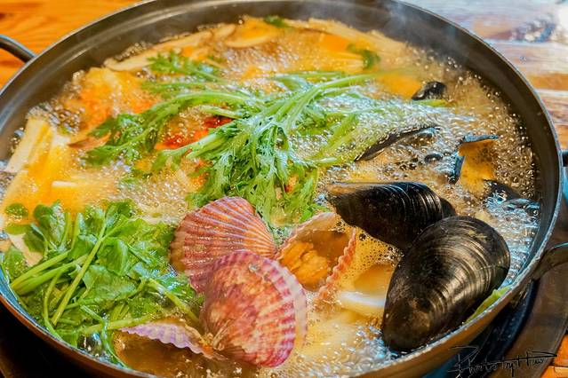 海鲜锅端上来的时候锅里面已经装满了菜,白菜萝卜蘑菇茼蒿等蔬菜打底,面上铺满了扇贝和青口贝。 和平 时吃到过的韩式汤锅不同,这里的海鲜锅里面没有常见的韩式辣酱。