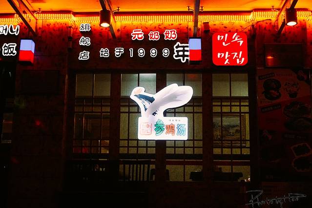 回酒店坐了一会儿暖了下身子,纠结要不要吃晚饭,毕竟距离下午的章鱼火锅吃完也才两个时辰,但想了一下虽然现在不是很饿,但如果不吃的话过会儿就真饿了没有太多可以吃的了,正好酒店旁边两百米的那家 延吉 网红餐厅元奶奶包饭的参鸡汤看评价也很不错的样子。就正好来把参鸡汤的草给拔了。暖暖的鸡汤在寒冬里喝着应该也是很舒服的。