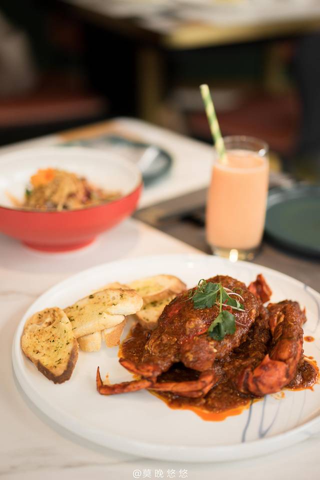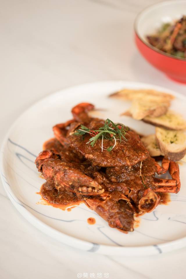 我们选择了辣椒炒,一上桌就香味四溢。超大个的珍宝蟹一只就是满满一盘了,里面的肉厚十足,辣炒做法非常入味,再加上香脆的烤面包一起吃,超级赞的。