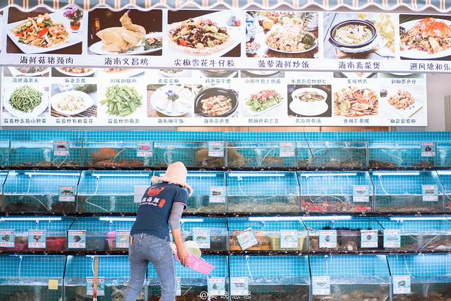 而在入门处呢,就可以看到一排排的海鲜池子,装满了生猛鲜活的海鲜,食客都可以现挑现做,真材实料看得见。