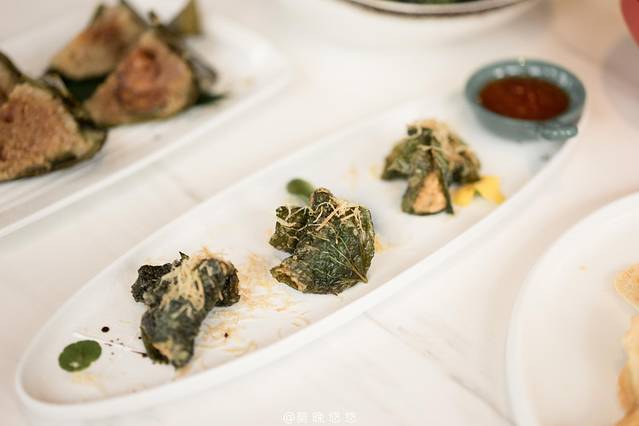 捞叶虾饼,非常精致的摆盘,吃起来香香脆脆的。外面这一层绿色的便是捞叶,是 海南 很有特色的一种食材,里面的就是虾饼了。