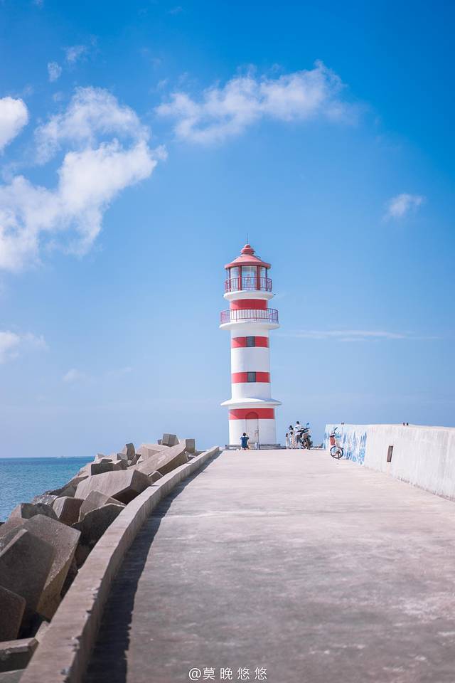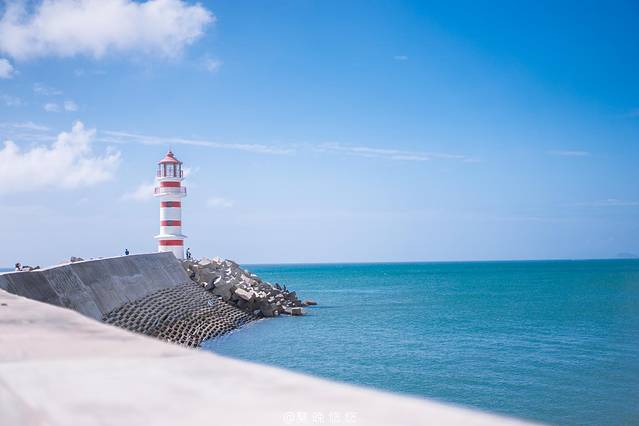 这里有着一个非常适合拍照的 灯塔 ,可以导航定位到神州半岛泰悦居,下了车之后需要走一段路,这一路都是紧临着大海的椰林,一边走一边拍照。大概几分钟左右就可以看到 灯塔 了,远远望去,红白相间。