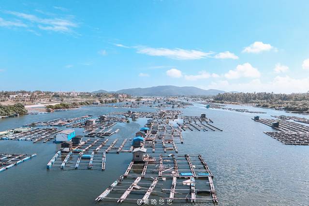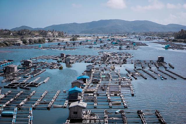 一排排的四方格房子浮在海面上,渔排中间还有可以穿梭的街道,就像一个漂浮于大海之中的小镇一般。