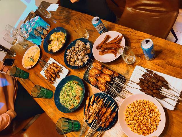 晚餐就在这里进行。童姐姐叫了好吃的川菜,娜姐带了好喝的红酒,重头戏是昊哥搬了一箱当天产的青啤,口感超级赞。