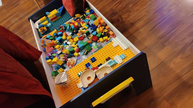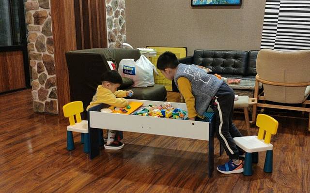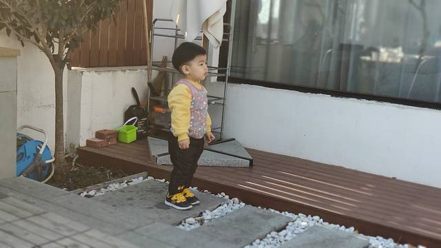 一会在院子里捡鹅卵石,一会儿在房间里玩儿乐高。