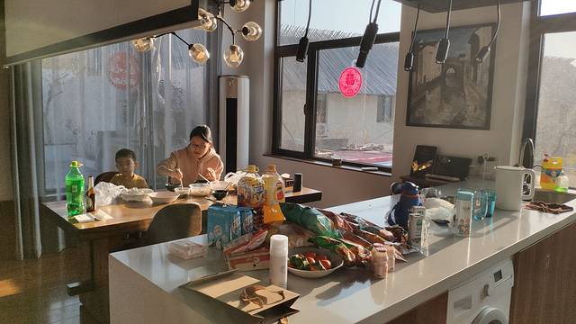 昊哥娜姐订了晚餐,洗净了水果。栋哥童姐带来零食,冰了啤酒。