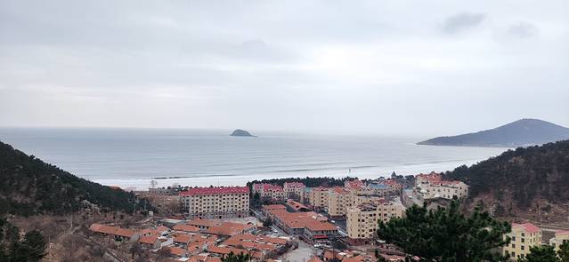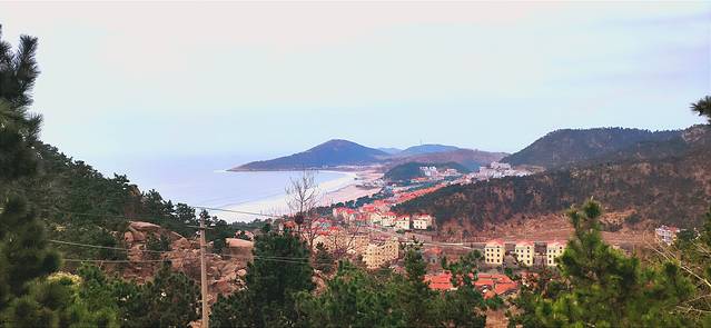 从盘山路往下看整个东麦窑村尽收眼底,尽头可以看到流清河湾的海面正在退潮。