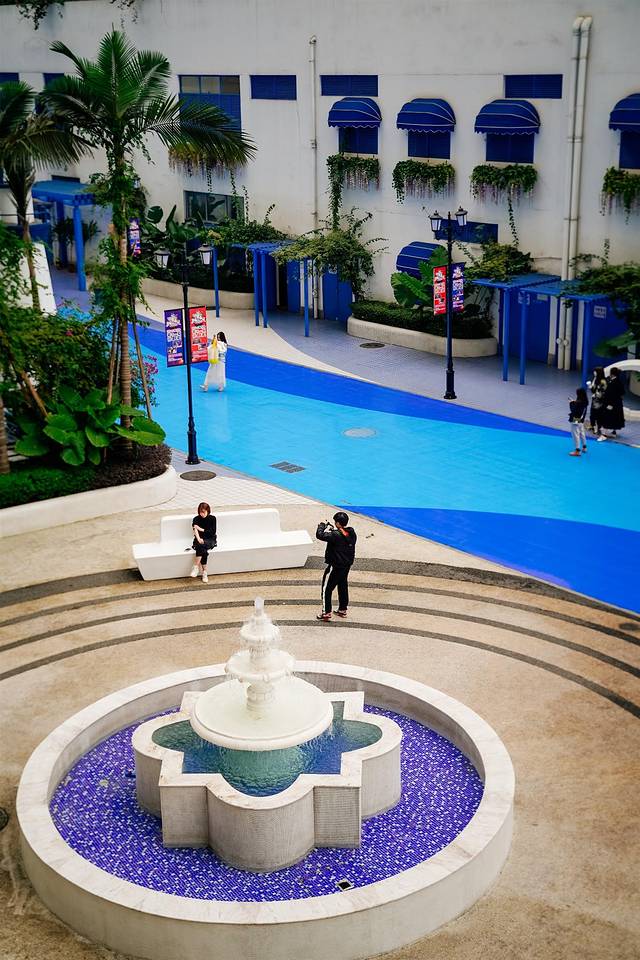 圣托尼里是位于希腊爱琴海的一个小岛,因其岛上建筑蓝白相间,衬以蔚蓝大海,深受游客们的喜欢。环球中心西商业就宛如成都版的圣托里尼小镇,灯塔、水池、鱼雕塑作为帮衬,大面积的地中海蓝与洁净的白相交织,让你有种到地中海度假的奇妙体验。