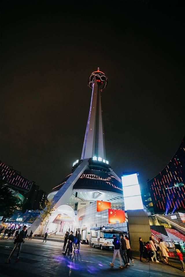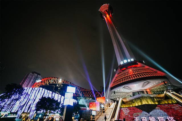 夜晚来临,电视塔及附近建筑的彩光灯相继开启,昏暗的夜色也成为了它的画布,灯红璀璨,耀眼夺人。
