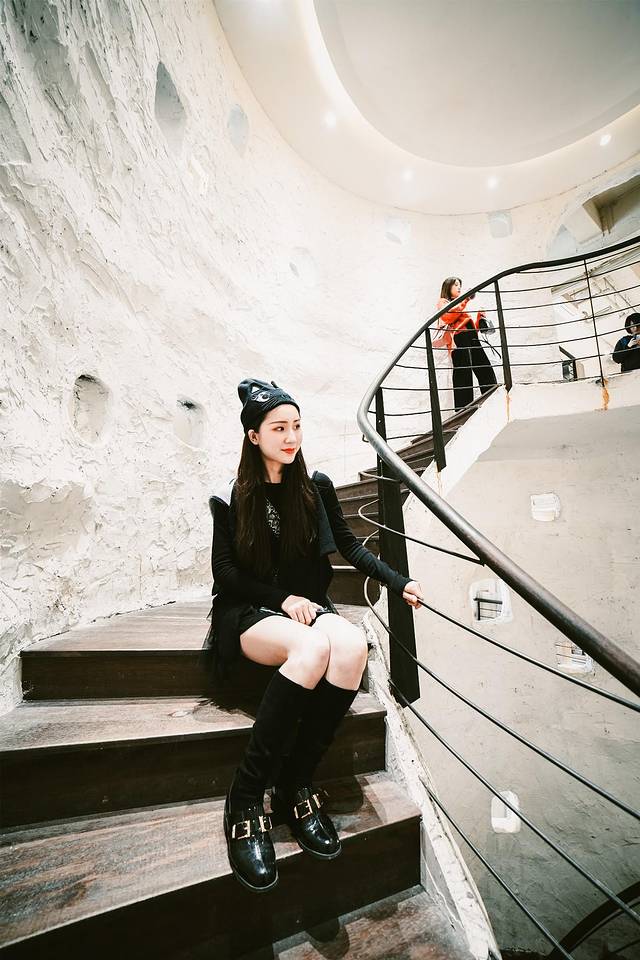 从四季花园往火车方向还有一条空中走廊,层层叠叠而上的黑色楼梯给人一种无限的纵深感。工业现代感十足,搭配上昏暗的光线,轻松拍出颓废冷酷风大片。