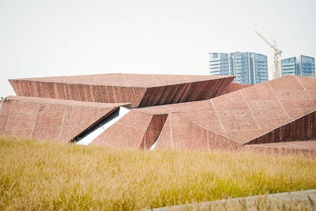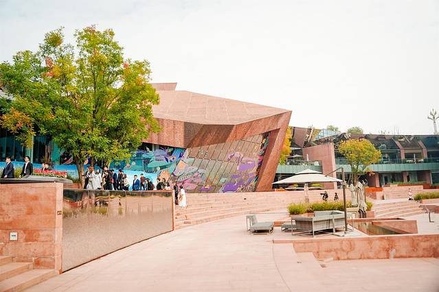 远离成都市中心的热闹繁华,周围湖水绿植环绕,仿佛遗世独立,与自然浑然天成。整体红色的建筑与周围的红砂岩地貌融为一体,抽象几何的建筑风格,更是让人赞叹不已。
