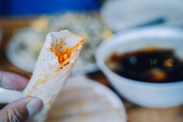 这还是小A第一次吃到这样的薄饼,小小的饼皮裹着脆生生的萝卜丝等配菜,再放到特制的醋汁里充分蘸取,酸酸甜甜的口感非常讨人喜欢~