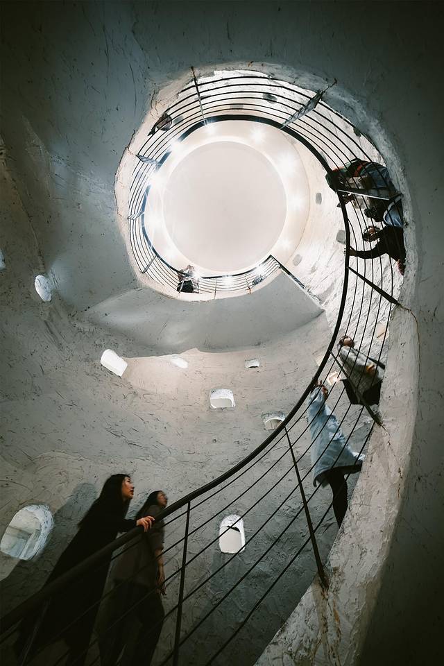 除了独特的旋转式楼梯,书店内的其他空间设计也是十分夺人眼球。充满原始纹理和颗粒感的墙面,简单利落的流线型走势,宛如宫殿般的弧形拱顶,处处彰显着艺术与现代的动人结合。