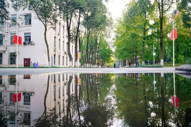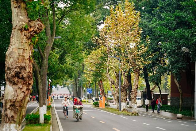 望江校区的玉章路,每年深秋时的银杏树一片金黄的景象也是来成都赏银杏风景的大好去处。在化学馆门口,更是有两颗被成都市政府编号的百年老银杏树哦,非常具有打卡意义了。