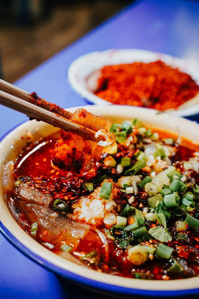 钵钵鸡有红油味和藤椒味,小A建议大家两种味道都不能错过。红油味钵钵鸡香麻感十足,表面铺满的一层芝麻更是提香不少。藤椒味钵钵鸡更偏麻辣的口感,藤椒的麻味和小米椒的辣味紧密融合在一起,给味蕾带来十足的刺激。