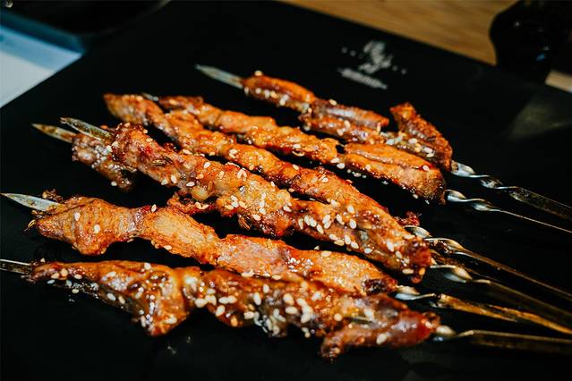 焖烤就是低温并且长时间烤制,这样焖烤出来的肉就能锁住肉质本身的鲜美和水分。而且焖烤也更加适合在大块肉上,所以店内的串串份量都是扎实的很。
