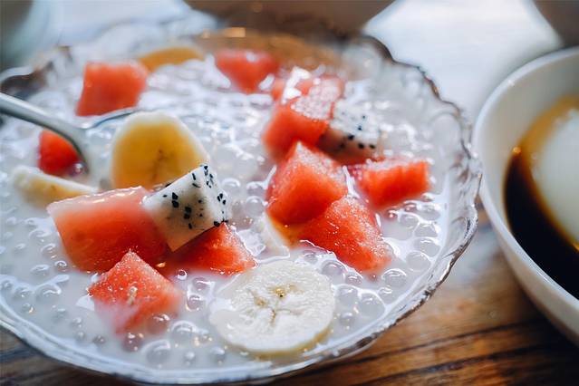 麻辣鲜香之后,当然需要来一份甜丝丝的冰品滋润一下。椰奶香十足的西米露,搭配上甜滋滋的当季水果,十足的解腻“神器”。