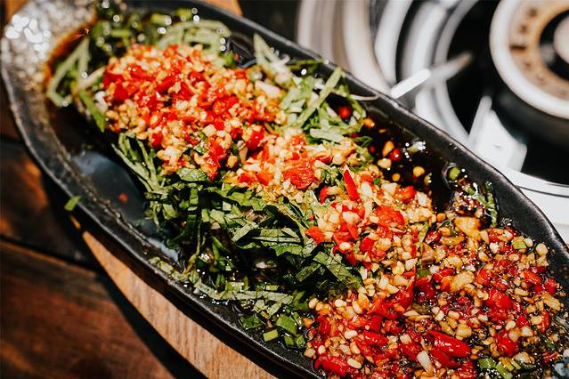 新鲜的生鱼现吃现杀,处理过的生鱼片直接放在火锅锅底的鹅卵石上高温烫熟,然后再用滚烫的火锅底汤搭配食用。这种做法完全保留了鱼肉的原汁原味,更搭配上火锅的麻辣鲜香,简直不要太巴适~