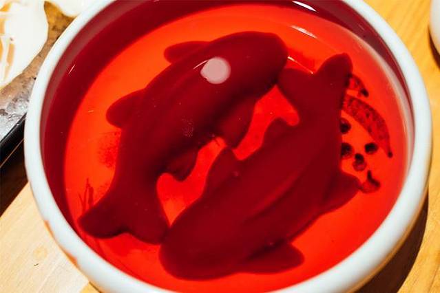 「锦鲤鸭血」,本以为就是那种一碗里面红红的鸭血,上来时都惊呆了!鸭血做成了两条锦鲤的形状,也太可爱了吧!锦鲤附身!好运来到!