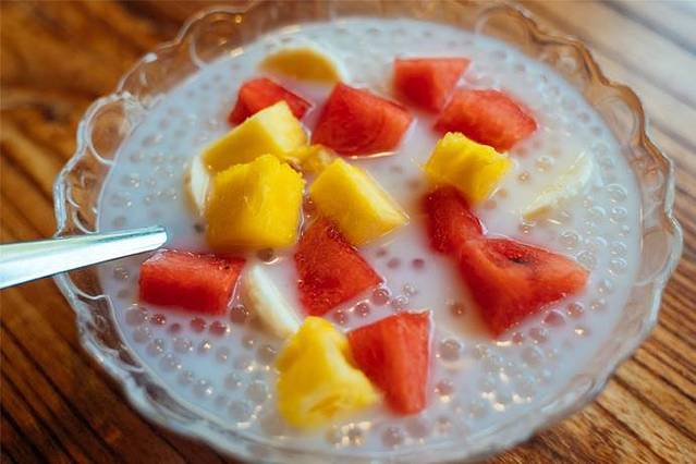 「水果西米露」、「炒米饭」和「醪糟荷包蛋」也非常好 ,醪糟蛋是相当相当好吃的,醪糟蛋是我喜欢的口感,酒糟的浓度恰到好处。钵钵鸡属于冷串儿,好适合在热辣的夏天里吃了。