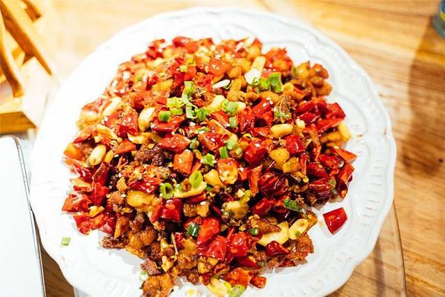 「歌乐山辣子鸡」这个菜有点像吃小零食哈,肉炸的脆脆的,看着一整碗的辣椒, 实际上不太辣,一口一口在辣椒里找鸡丁,也吃得很开心。