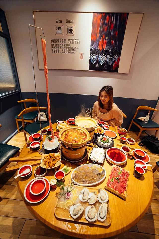 在武侯祠大街中站上车,乘坐57路公交车,坐个四站,在文翁路站下车,走一小会儿就到了鲜炎火锅。到那的时候十一点十几分,刚营业一小会儿,不用排队,我们都暗自窃喜,马上可以开吃了。店虽不大但环境很好,暖灯光,正是适合吃火锅的氛围。装修还是挺用心的,炒料的,切肉的,海鲜,新鲜蔬菜都看得见,播放的音乐也很让人感到轻松,很有氛围。这家店主打新鲜二字,据说都是现切现杀的,没有冰冻的东西!还没进门就远远的能看见他们家的特色了!