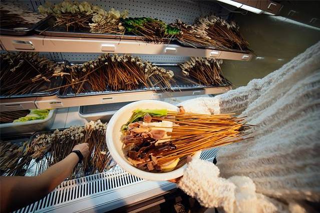 它们家比较特色的就是烤肉是放在一个土罐子里面焖烤,两个大焖炉里挂满了新鲜的肉串。焖烤的一大特点就是整个烹制过程都在炉内,所以所有的材料必须提前码料才能入味。
