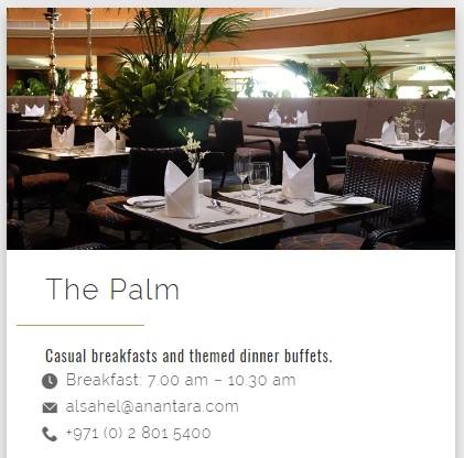 在The Palm餐厅以国际和中东特色的自助早餐开始新的一天。 暮色降临后,微风吹拂的具有现代阿拉伯装潢的餐厅,不时会举行主题晚会。 凭借具有多种菜式的菜单以及驻店葡萄酒大师的专业知识,The Palm餐厅是萨巴尼亚最顶尖的餐饮场所之一。