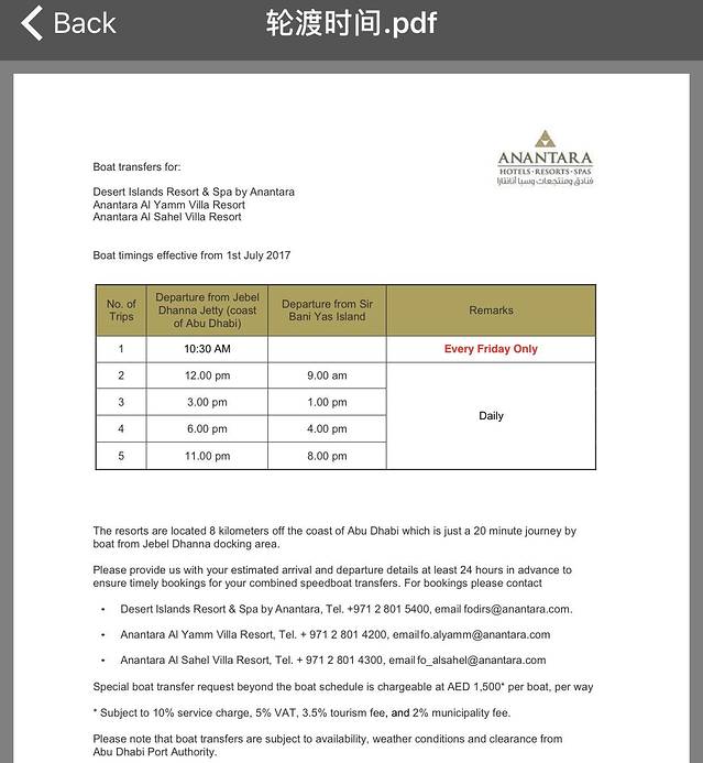 如果预定阿提哈德航空的商务舱,将有豪华轿车从阿布扎比机场送往杰贝勒德哈那码头,然后在码头乘坐摆渡船上岛。