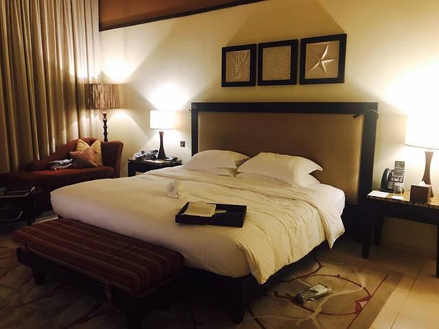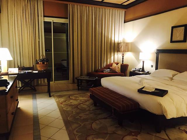 推开门,房间里装饰着本地独有的织物和原创艺术品,展现出浓郁的阿联酋风情,温暖的海岛阳光与清冷的硬木家具形成鲜明对比,躺在舒适的超大号床上(感觉有两米五宽),尽享挺括的高级密织纯棉床品以及蓬松羽绒被和羽绒枕带来的极致舒适奢华,在埃及棉的丝滑和温柔下入眠。
