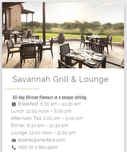 这处专属餐厅,犹如一栋豪华的狩猎风格小屋,提供与之完美相配的西方风味和非洲特色美食。每天清晨享受丰盛的自助早餐。中午回到这里,享用清淡经典又不乏新意的午餐,晚些时候还有下午茶和蛋糕。 晚上伴着篝火,在露天平台上用餐,品尝淳朴而现代的烧烤菜肴,佐以我们葡萄酒大师推荐的美酒。