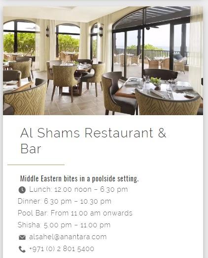 池畔吧台让客人在享受日光浴时也能品尝美食。Al Shams宽敞的休息区备有日光浴床,供客人午后游泳休闲或在伞下享用小吃。该处全天候供应各种美味小吃和饮品,为您营造轻松随意的氛围,是家庭同乐的好去处;而各种口味的中东水烟则是完美的临睡享受。