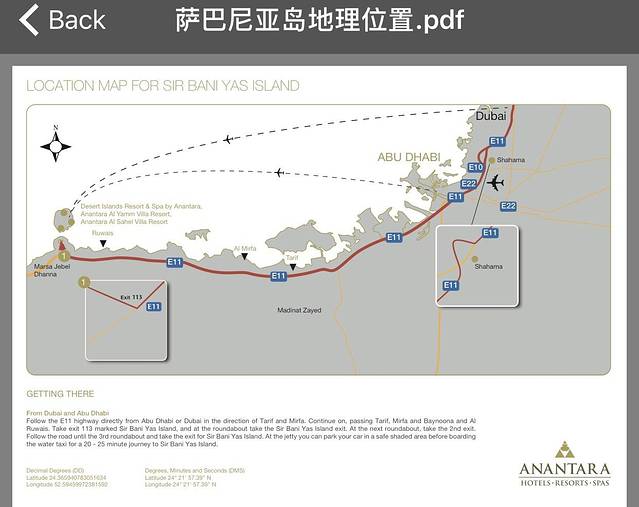 萨巴尼亚岛距阿布扎比国际机场250公里,如果自驾,可以从阿布扎比或迪拜直接沿E11高速公路,向塔里夫(Tarif)和莫法(Mirfa)方向行驶。一直前行,经过过塔里夫、莫法及贝努那和阿鲁瓦斯。从标有萨巴尼亚岛的113号出口驶出,在交通环岛走萨巴尼亚岛出口。在下一个交通环岛,走第二个出口。沿路前行,直到第三个交通环岛,走萨巴尼亚岛和杰贝勒德哈那码头出口。在码头把车停在安全的有蓬停车区域,然后乘20min摆渡船上岛。