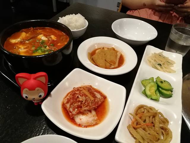 从配菜就可以看出韩料很正宗,哈哈。点了嫩豆腐汤,送米饭、泡菜、黄瓜等小食,吃法和味道都和韩国当地如出一辙,推荐!泡菜好好吃!花费$16.5,不错哦!